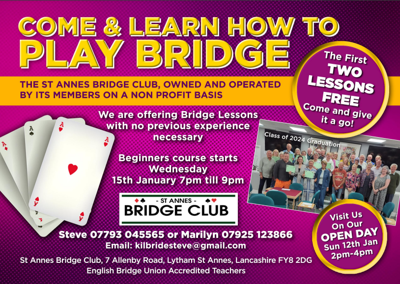 We are a friendly club based in St Annes, on the Fylde Coast, dedicated to playing, teaching and competing in the card game of bridge.